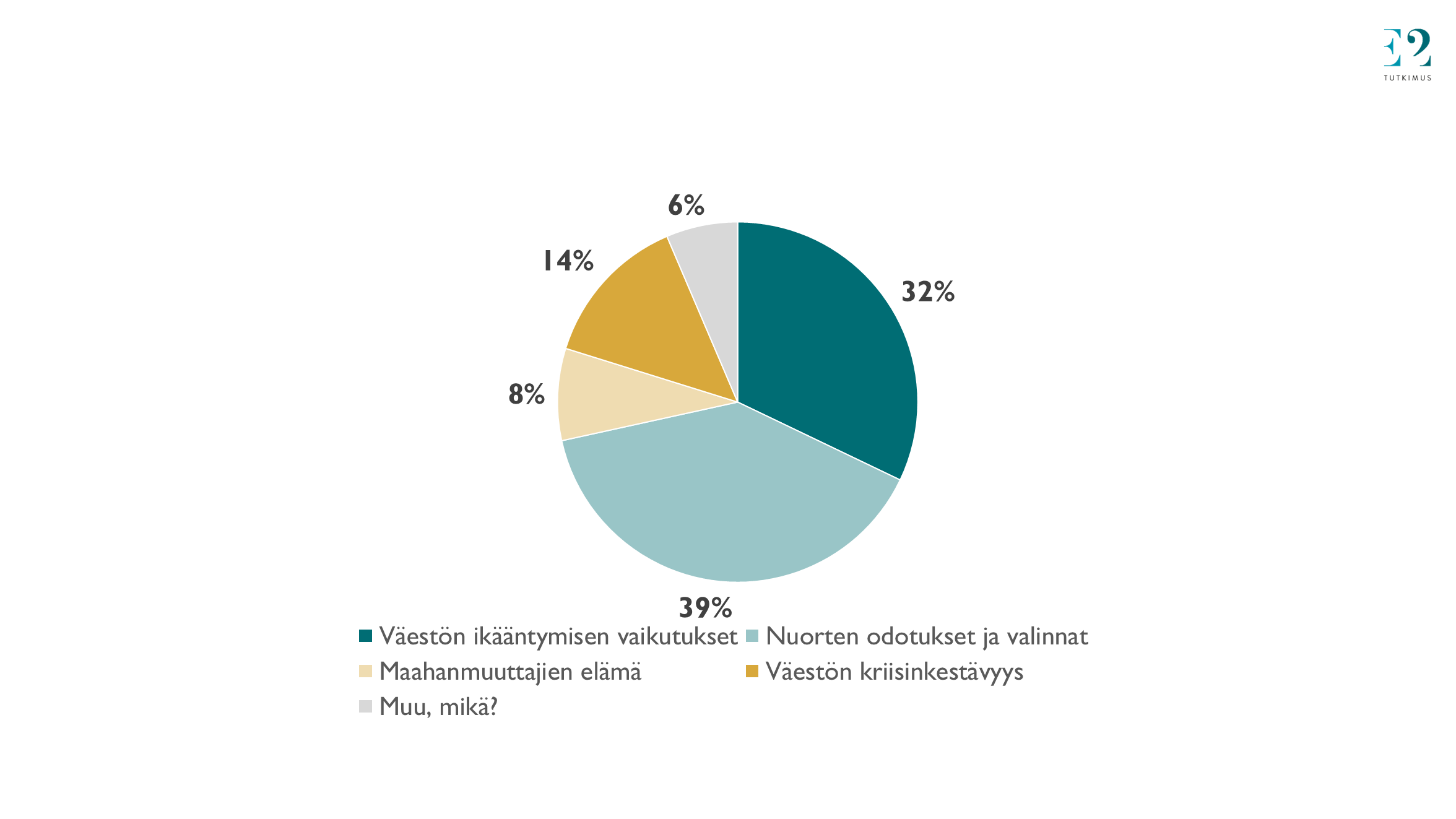 Nuorten odotukset ja valinnat nousi äänestyksen kärkeen (kuvio 1). Sen valitsi 39 prosenttia vastaajista. Toiseksi sijoittui väestön ikääntymisen vaikutukset (32 %). Juuri Kuntamarkkinoiden alla julkaistu MDI:n väestöennuste oli monella mielessä, mutta toisaalta syntyvyyden, alueiden pitovoiman ja ikääntymisen kysymykset ovat olleet ajankohtaisia monella paikkakunnalla jo pitkään. Äänestyksen tulosten ja käytyjen keskustelujen perusteella alueilla tilannetta lähestytään hyvin ratkaisukeskeisesti: Miten nuoret saadaan jäämään synnyinseuduilleen pitämään yllä alueen elinvoimaa ja rakentamaan tulevaisuutta seuraaville sukupolville?