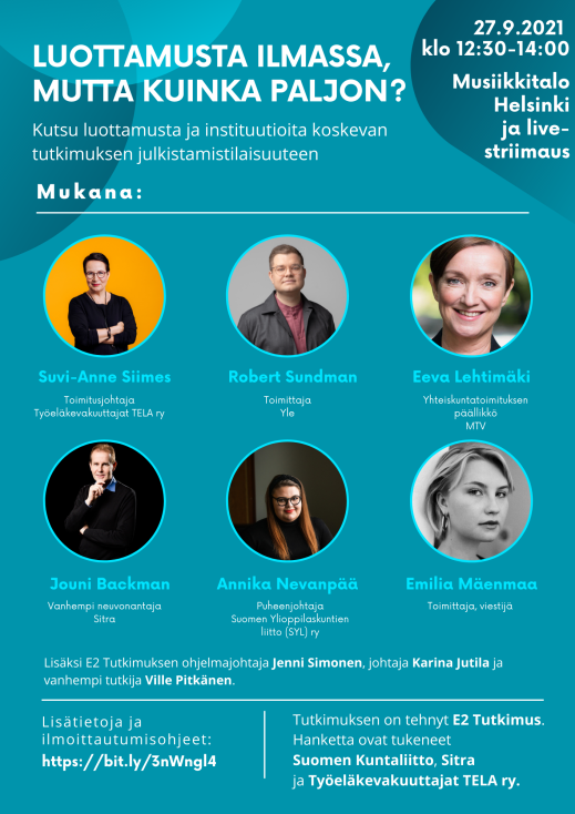 ”Luottamusta ilmassa, mutta kuinka paljon? Tutkimus eri sukupolvien luottamuksesta yhteiskunnan instituutioihin” julkistetaan maanantaina 27.9.2021 klo 12.30–14.00 Helsingin Musiikkitalossa, Mannerheimintie 13 A.