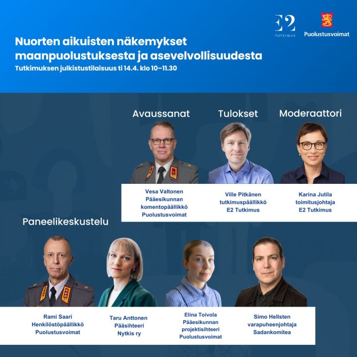 Tervetuloa kuulemaan tuoreita tutkimustuloksia nuorten aikuisten maanpuolustus- ja asevelvollisuusasenteista. Tulokset pohjautuvat edustavaan kyselyaineistoon (18–30-vuotiaat, N=2030) ja nuorten aikuisten haastatteluihin. E2 Tutkimus toteutti työn Puolustusvoimien toimeksiannosta.